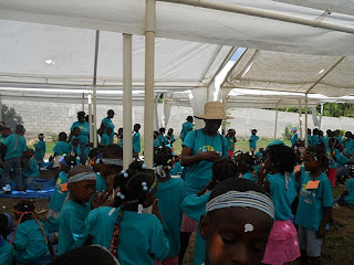 On to "Kids Fest". Some statistics you may be surprised at. We have 530 children (including our own orphans). We have 65 Haitian leaders who came in and trained to do the camp. We also have 5 helpers, who see to the children's needs throughout the day. (Example, bathroom breaks). We have 6 Haitian cooks who make a meal for 618 people every noon. The main meal is beans and rice with meat included. And we had 13 Americans come in to help teach the leaders. Now, on to our day... We have morning chapel with the whole group. We pray and teach them songs. Then they go on to the different areas. There are a third of the kids in Bible Study, a third in crafts, and a third in competition and games. They switch off and everyone gets to participate in all three areas. Note: the different "headbands" tell you what group they are in and who their leaders are.